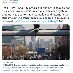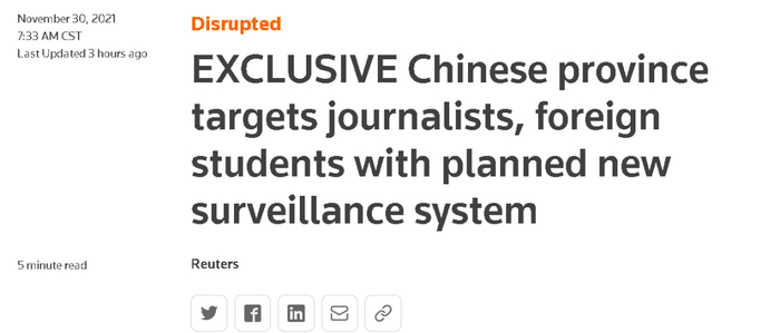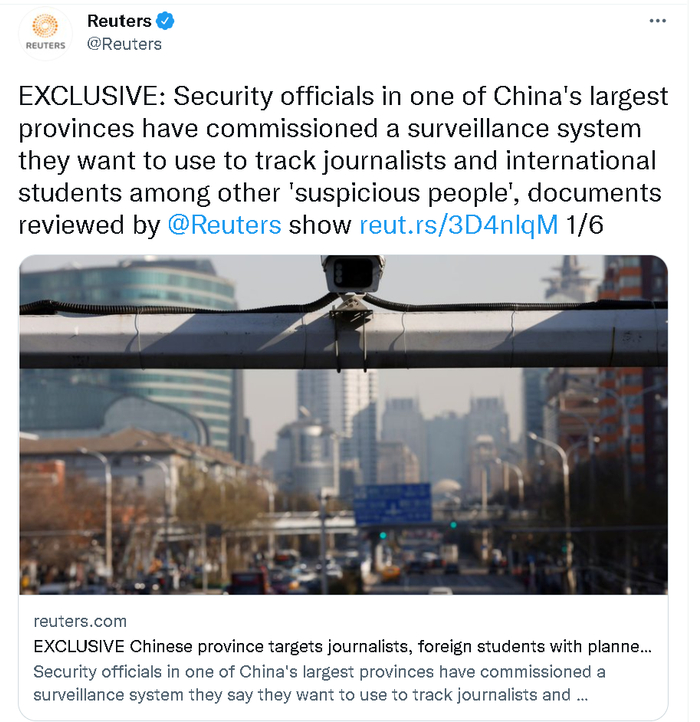 如下图所示,北京时间今天(11月30日)凌晨,路透社在其网站和社交账号上发布了一则消息,称中国河南省的警方正在通过人脸识别和大数据以及监控探头等系统追踪当地的“记者”和“国际留学生”等 “可疑分子”。