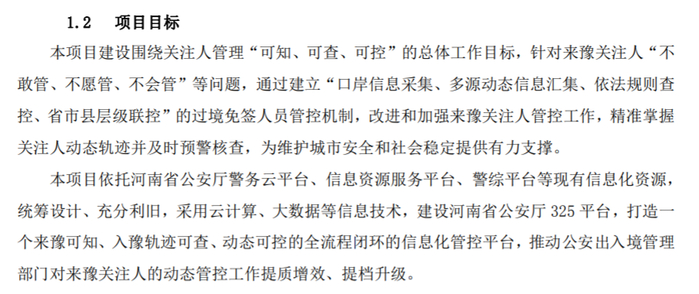 该招标文章第五章的“建设原则”和“项目目标”等条目中都明确提到,这是一个“需要围绕出入境关注人管理警务实战的需求”而建设的系统,为的是“打造一个来豫可知、入豫轨迹可查、动态可控的全流程闭环的信息化管控平台,推动公安出入境管理部门对来豫关注人的动态管控工作提质增效、提档升级。”