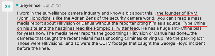 而IPVM的创始人John Honovich更是被吐槽为“安全摄像头领域的郑国恩”。(注:郑国恩是一个长期为西方反华势力编造抹黑新疆的谣言、为西方媒体提供抹黑中国议题的“马甲”,路透社亦曾与此人勾结发表过抹黑中国的“独家报道”)