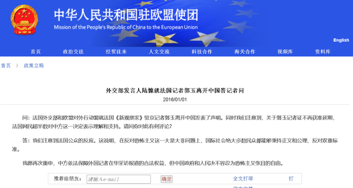 其次,有不愿意透露姓名的知情人士对耿直哥表示,外国记者在入境时,通常持有的签证是J开头的记者签证。如果他们在中国活动时多次触犯法律法规,或严重触犯中国人民的底线,就会被“请出”中国。比如2016年初,法国《新观察家》驻京记者郭玉(Ursula Gauthier)就因为在2015年11月撰写的一篇报道中公然为恐怖主义行径、为残忍杀害无辜平民行径张目,引发了中国民众的公愤,结果其外国记者证不再被准许延期,她被限期于2016年1月1日离境。