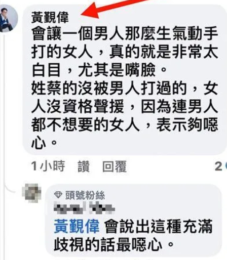 不过,一片声援中,国民党中央委员黄觐伟在相关报道下方留言“会让一个男人那么生气动手打的女人,真的就是非常太白目”,被网民批评后还回呛“被打活该”,引发争议。黄觐伟事后删除了相关留言,但网民对其的指责没有停止。