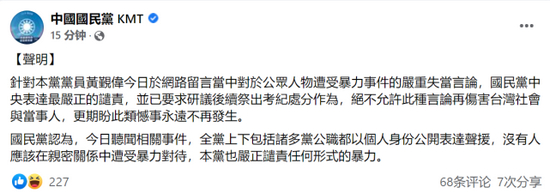 随后国民党官方脸书发布声明称,针对黄觐伟对于公众人物遭受暴力事件的严重失当言论,表达最严正的谴责,会在研究讨论后作出考纪处分处理,没有人应该在亲密关系中遭受暴力对待,严正谴责任何形式的暴力。