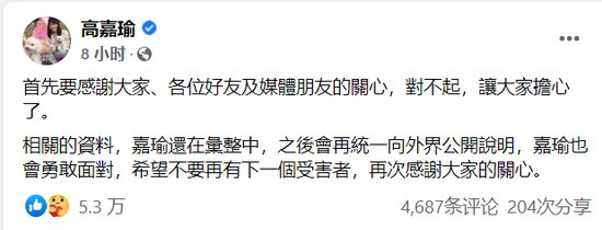 随后高嘉瑜在脸书发文,感谢大家关心,之后会统一向外界说明情况,并称自己会勇敢面对,“希望不要再有下一个受害者”。