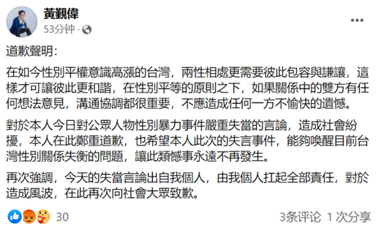 30日晚,黄觐伟在脸书发文道歉,称希望此次失言事件能够唤醒目前台湾性别关系失衡的问题,让此类憾事永远不再发生,并称对失当言论负全责。