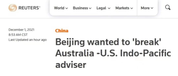 路透社:美国印太顾问称北京想要打击澳大利亚