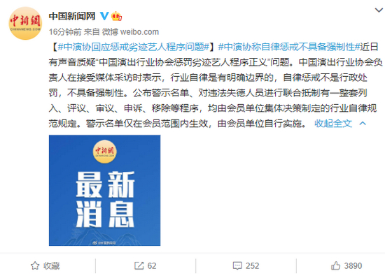 中演协回应惩戒劣迹艺人程序问题:不具备强制性