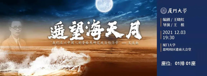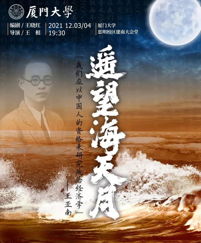 话剧《遥望海天月》(原名《王亚南》)着力表现王亚南校长孜孜不倦、严谨求实的科学精神。王亚南一生追求真理,献身科学,致力于马克思主义的翻译、传播、研究。在国难当头内忧外患的年代,王亚南不惧艰难险阻与郭大力共同完成了《资本论》全译本的翻译出版,为马克思主义在中国的传播和对马克思主义经济学研究的深刻探索做出重要贡献。剧目还生动讲述了作为 “懂得人的价值”的教育家王亚南校长爱才惜才为厦门大学教育事业作出巨大贡献的动人故事。