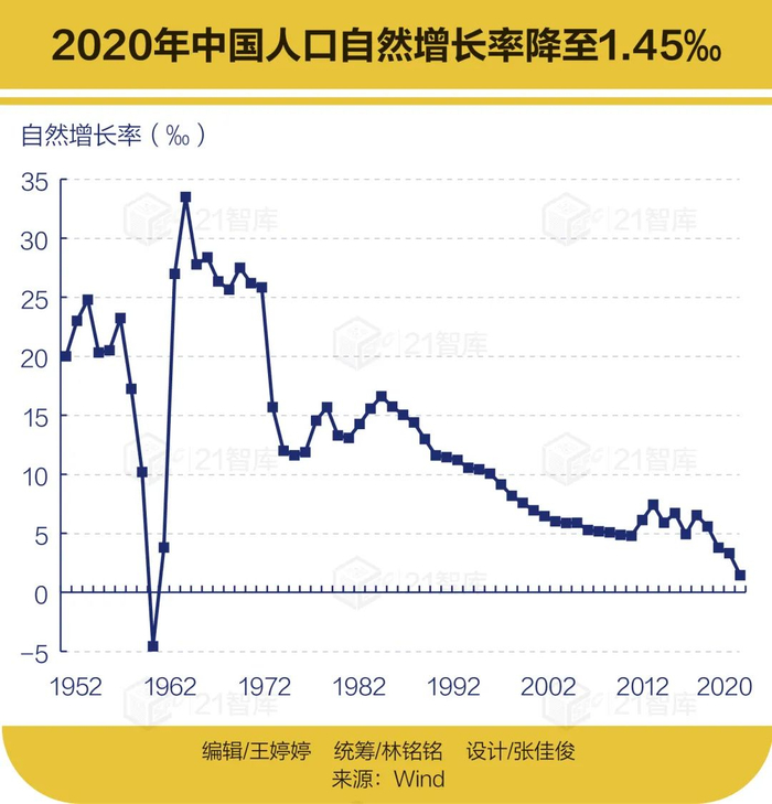 据中国统计年鉴(2021年),2020年中国人口自然增长率大幅回落至1.45‰,创下数十年来的新低。