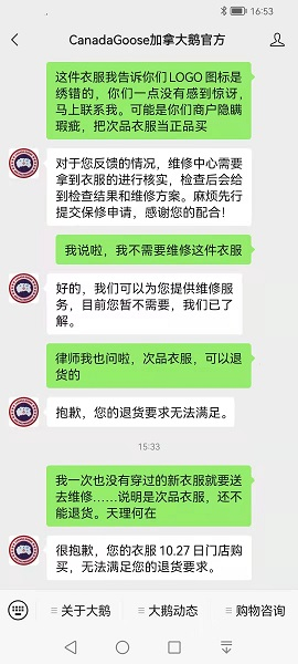 发现质量问题后,购买者向加拿大鹅门店店长投诉,同时拨打了加拿大鹅客服热线。可店长称没有权力退货,需要总公司层面来解决,但店长没有办法提供总公司联系方式,要购买者自己去查,还说公司已经向市场监管局方面提供了这件衣服的报关单和合格的检测报告。要求购买者提供给公司衣服不合格的检测报告,才可以退货。