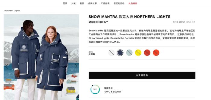 相关介绍称,加拿大鹅的“工艺几乎代表北美的最高水准”,“从设计、剪裁到缝纫加工都在加拿大国内进行,并且全是高级手工制作”,“严丝合缝,滴水不漏”,采用的“Arctic Tech”面料,防风防雨雪,相当于“一件外面自带冲锋衣的羽绒服,能抗极端环境和气候”。