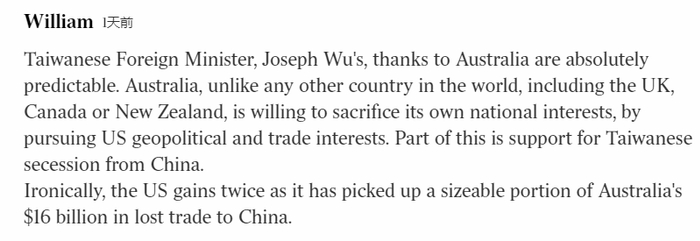 “台‘外长’吴钊燮对澳大利亚的感谢是完全可以预见的。与英国、加拿大或新西兰等其他国家不同,澳大利亚愿意牺牲自己的国家利益,去追求美国的地缘政治和贸易利益。(澳)所做的部分举措就是支持台湾从中国脱离出去。具有讽刺意味的是,在澳大利亚对华160亿美元的贸易损失中,美国捡起很大一部分份额,获益了两倍。”