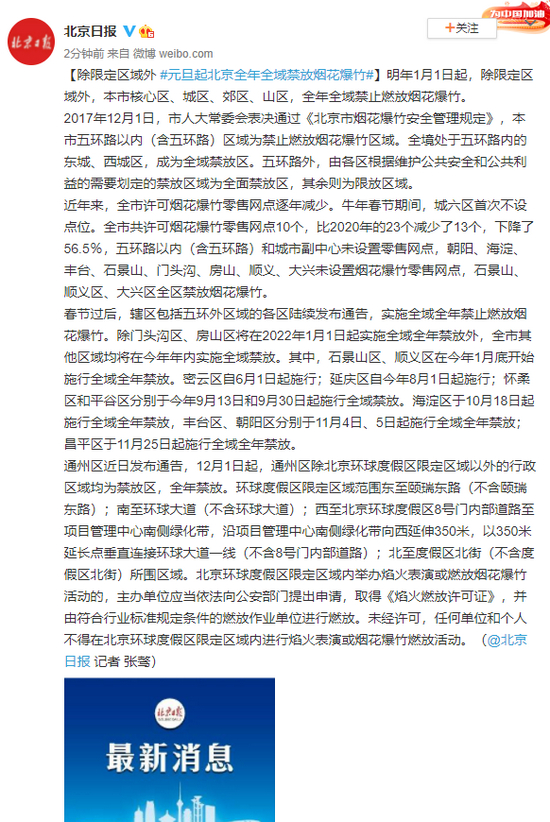 原标题:除限定区域外 元旦起北京全年全域禁放烟花爆竹