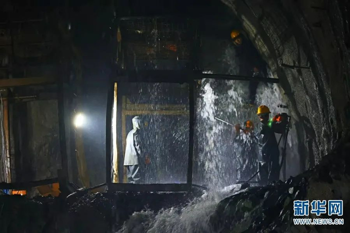 吕红军(左)在景寨隧道内查看收尾工作(摄于10月26日)。赵普凡 摄高地温尚且可以通过加装风机、投放冰块来缓解,突泥涌水、软岩变形则防不胜防。吕红军记得,突泥最严重的一次,掌子面往后150米全被泥浆填满了,直接把工程进度拉成了负数。大涌水的时候,洞内如同下起大暴雨,工人们都泡在水里施工。还有软岩变形,最严重的一次,初期支护变形达到2.2米,把双层钢拱架扭成了S形,只能一边向前开挖,一边调头处理变形。