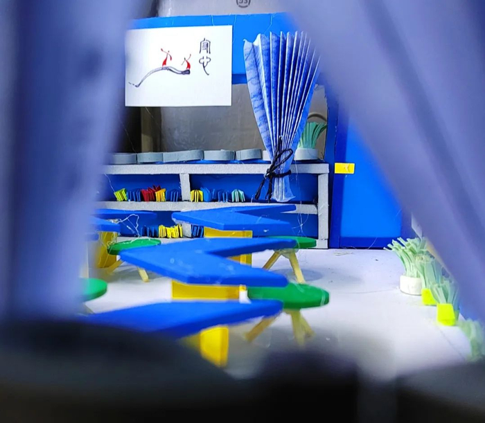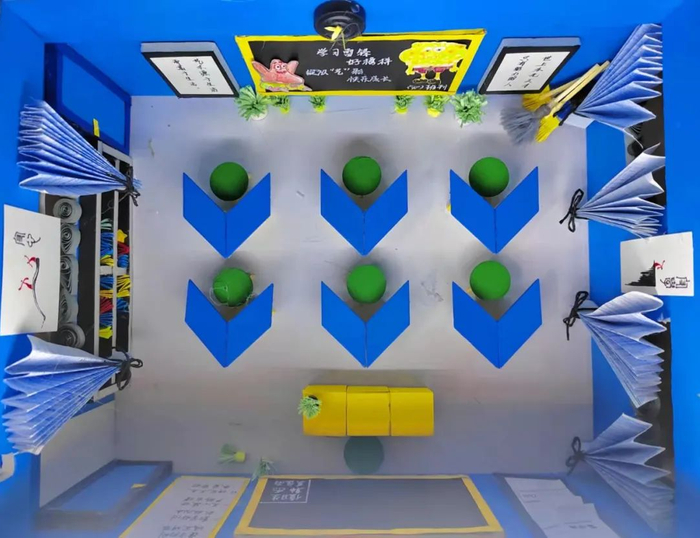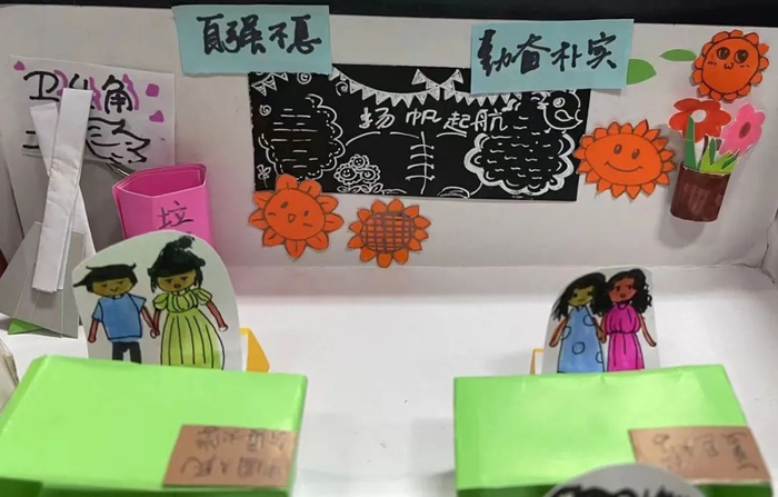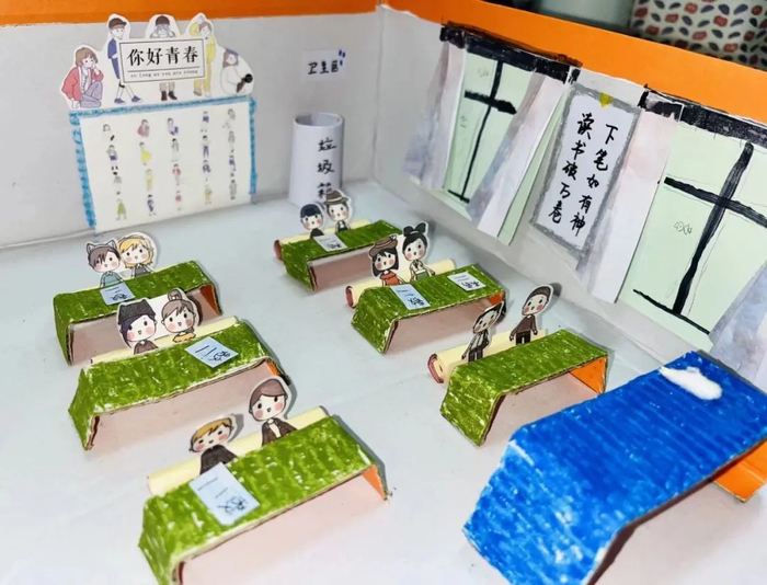 黑板、桌椅、书架、文化墙、卫生角……全部藏在这间温馨的“鞋盒教室”里,可谓是“麻雀虽小五脏俱全”。这是学校为提升师范生素养,开设的选修课《班主任工作》的课程作业,全部由学生亲手制作完成。