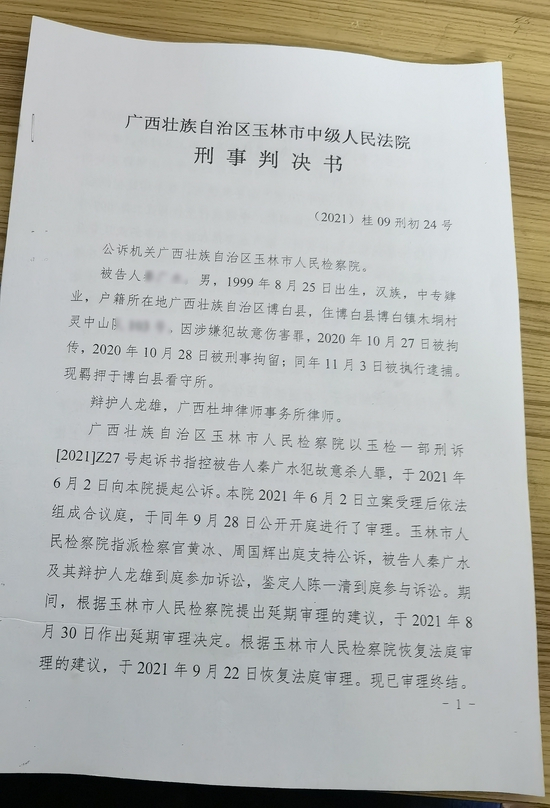 记者在判决书上看到,玉林市人民检察院指控,2020年10月27日凌晨,22岁的被告人秦广水酒后在博白县城游荡,当天早上8时许,来到博白县人才交流中心通往饮马江二路的巷子,向路经此处的被害人李绍武(男,殁年70岁)借手机使用。遭拒后,秦广水心生怨气,便尾随李绍武,突然加速冲向他,从背后将其打倒在地,并用拳头连续猛击其头部、项部。李绍武多次挣扎起身,均被秦广水摔倒、压在地上,被踩住手或勒住脖子无法反抗,并遭对方猛踩头部和项部、用拳头猛击其面部多次,还被对方以手掐或手前臂卡压其颈部三十余秒钟。李绍武受伤趴地不起,秦广水走向附近一早餐店将在店用餐的群众吓跑后,又返回继续用脚猛踩李绍武头部、项部。秦广水上述殴打行为致李绍武头部、面部流血、多处受伤,当场倒地不起,经送医抢救无效,于2021年3月8日死亡。