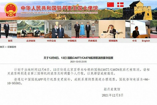 中国驻丹麦大使馆12月3日发布紧急提醒称,计划于当地时间12月6日、13日往返北京至哥本哈根的国航CA877/CA878航班已被取消。请相关旅客特别是自第三国转机的旅客及时调整个人行程,以免滞留或被遣返。