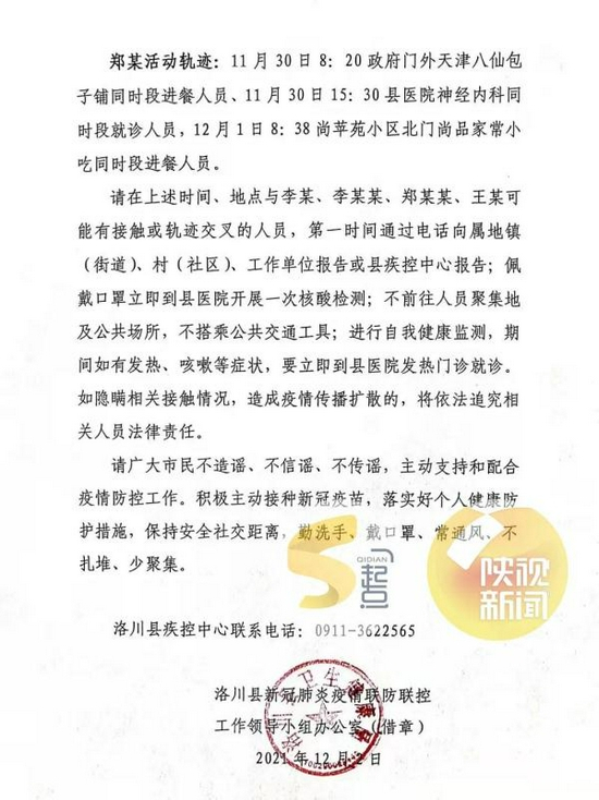 郑某活动轨迹:11月30日8:20政府门外天津八仙包子铺同时段进餐人员、11月30日15:30洛川县医院神经内科同时段就诊人员,12月1日8:38尚苹苑小区北门尚品家常小吃同时段进餐人员。