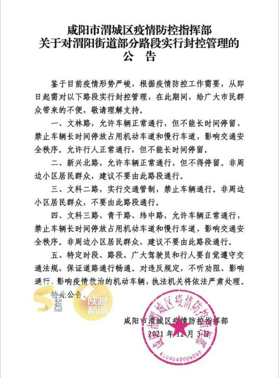 12月3日,咸阳市渭城区疫情防控指挥部发布最新消息:鉴于目前疫情形势严峻,根据疫情防控工作需要,从即日起需对渭城区渭阳街道部分路段实行封控管理,在此期间,给广大市民群众带来的不便,敬请理解支持。