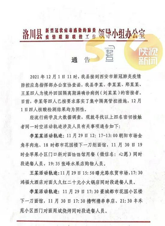 2021年12月1日11时,洛川县李某、李某某、郑某某、王某四人为境外回国隔离期满确诊病例(刘某某)的密接者。目前,李某等四人已按要求落实了集中隔离管控措施,12月1日四人核酸检测结果均为阴性。