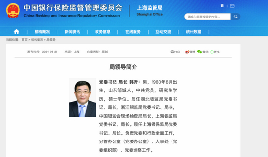公开资料显示,韩沂生于1963年8月,山东邹城人。他出身自人行系统,1985年7月起在人行浙江省分行、绍兴市和宁波市分行、上海分行等地工作。2003年银监会成立后,转到银监系统,曾任浙江局银监局办公室临时负责人、主任,2004年升任副局长。2009年,韩沂调任湖北银监局,升为局长。两年多后,他重返浙江,出任浙江银监局党委书记、局长。2015年,他北上出任银监会现场检查局局长。在北京短暂工作一年多以后,韩沂于2016年11月回到南方,担任上海银监局局长,并在2018年11月上海银保监局成立后,一直担任上海银保监局局长。