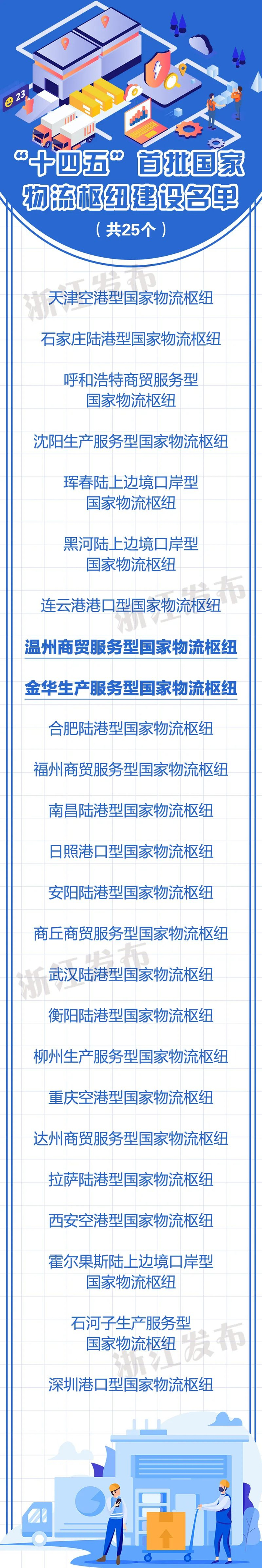 近日,国家发展改革委印发《关于做好“十四五”首批国家物流枢纽建设工作的通知》,25个枢纽入选“十四五”首批国家物流枢纽建设名单。其中,浙江省温州商贸服务型国家物流枢纽、金华生产服务型国家物流枢纽上榜。