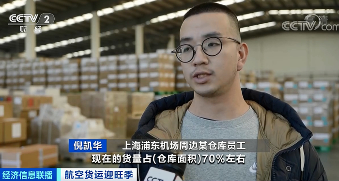 上海浦东机场周边某仓库员工 倪凯华:这个仓库有4000多平方米,加后面两个仓库差不多7000平方米左右,现在的货量占仓库面积70%左右。