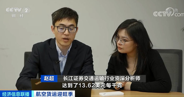 长江证券交通运输行业资深分析师 赵超:中美航线的航空货运价格已经创了历史极值,达到了13.62美元每千克,和2019年相比,同比涨了3-4倍,中欧航线的运价今年以来也持续上涨,相较于年初基本已经翻倍。