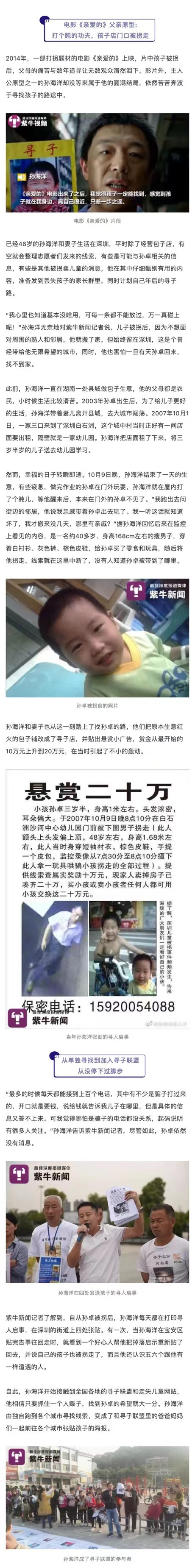 12月6日,公安部开展团圆行动认亲活动,帮助离散十余年的3组家庭实现团圆,其中也包括电影《亲爱的》原型人物之一孙海洋与儿子孙卓。《亲爱的》主演张译今天在微博上发文说,“孙海洋兄是我的角色韩德忠的原型人物,想起初见面那天,他的痛苦令我完全不知道能说些什么。《亲爱的》为我们收获了观众,带来了荣誉,也让我一直牵挂着他的儿子。今天,终于!哭着看完直播,五味杂陈,最想说的一句话:祝贺孙海洋一家终获团圆,愿天下无拐,感谢人民警察!”
