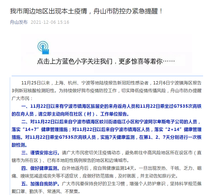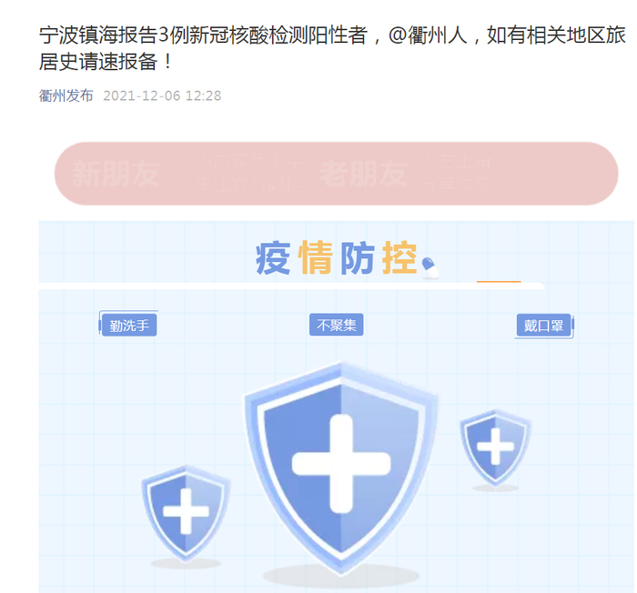 12月6日宁波镇海区报告3例新冠核酸检测阳性。多地发布防控办紧急提醒: