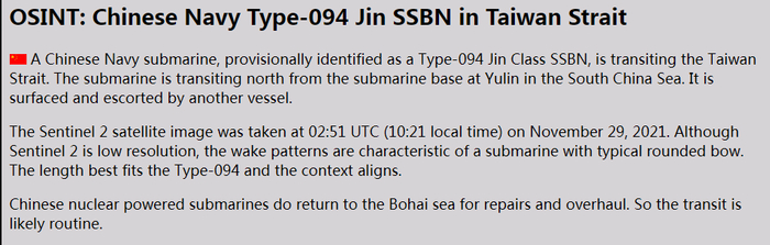 至于萨顿是如何判断的?他在11月29日的个人博客里写道:“一艘中国海军潜艇——暂时认定为一艘094型战略导弹核潜艇,正在通过台湾海峡。这艘潜艇正从榆林基地向北航行,潜艇浮出水面并有一艘舰船为其护航。”“虽然‘哨兵-2’号的分辨率很低,但该潜艇产生的尾迹形状是圆形艇艏潜艇的典型特征,此外其长度与094型核潜艇最为符合。”