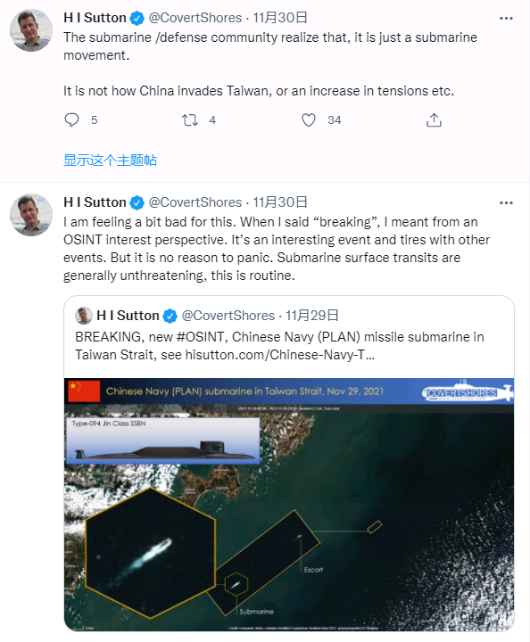 何况还有萨顿后续还有补充说明。在11月30日发现关于“中国核潜艇通过台湾海峡的”的判断引起外界热炒后,他在社交媒体上接连发文澄清说,“潜艇上浮航行通常是无威胁的,这是例行的行为”“这不是中国如何入侵台湾,也不是紧张局势的加剧”“抱歉,如果我引起了恐慌或过度兴奋”。