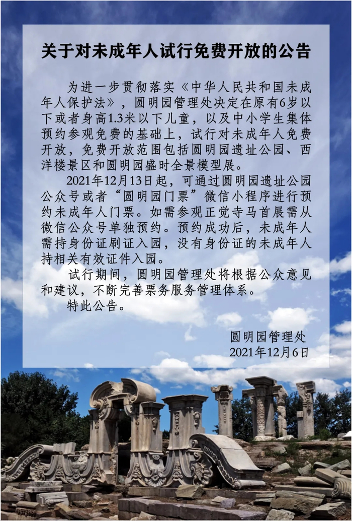来源:北京发布圆明园管理处12月6日发布《关于对未成年人试行免费开放的公告》,自12月13日起,试行对未成年人免费开放,免费开放范围包括圆明园遗址公园、西洋楼景区和圆明园盛时全景模型展。具体通知如下: