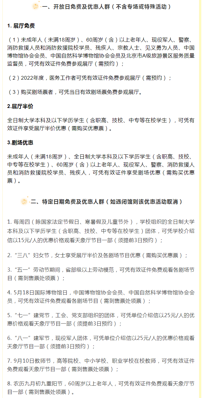 北京天文馆12月6日发布《北京天文馆票价免费及优惠政策(试行)》,12月8日起,天文馆展厅将对未成年人(未满18周岁)免费开放。具体通知如下: