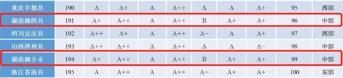 其中,湖南有长沙县和浏阳市分列全国县域经济基本竞争力排序(共195名)第5名和第10名,宁乡市和醴陵市分别摘得第18名和第59名的好成绩,上榜的还有湘潭县135名、邵东市159名、湘阴县191名、湘乡市194名。