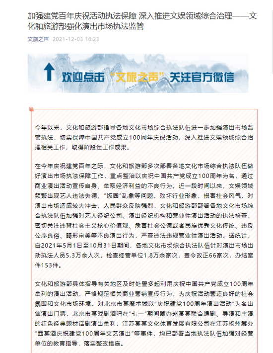 在今年庆祝建党百年之际,文化和旅游部多次部署各地文化市场综合执法队伍做好演出市场执法保障工作,重点整治以庆祝中国共产党成立100周年为名,通过商业演出活动宣传自身、牟取经济利益的不良行为。近一段时间以来,文娱领域频繁出现艺人违法失德、“饭圈”乱象等问题,败坏行业形象,损害社会风气,对演出市场造成较大冲击,人民群众反映强烈,文化和旅游部部署各地文化市场综合执法队伍加强对艺人经纪公司、演出经纪机构和营业性演出活动的执法检查,密切关注违背社会主义核心价值观、危害社会公德或者民族优秀文化传统、违反公序良俗、畸形审美等不良演出行为,严查违法违规营业性演出活动。据统计,自2021年5月1日至10月31日期间,各地文化市场综合执法队伍针对演出市场出动执法人员5.3万余人次,检查经营单位1.8万余家次,责令改正66家次,办结案件153件。