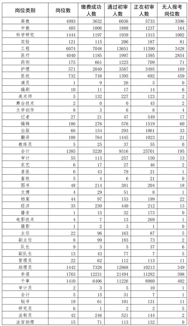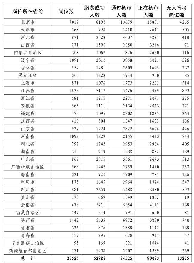 截至12月7日17时,提交报名资格条件初审共251243人次,通过报名资格条件初审的报考人员94525人,缴费成功的报考人员52883人,用人单位正在进行报名资格条件初审的报考人员90033人。