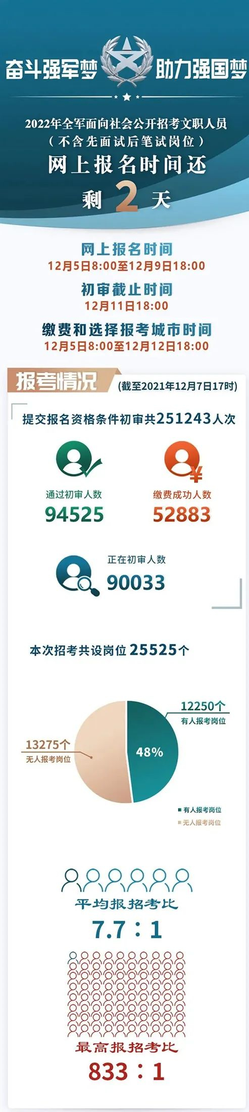 有人报考的岗位12250个、占47.99%,平均报招考比为7.7:1,最高报招考比为833:1。