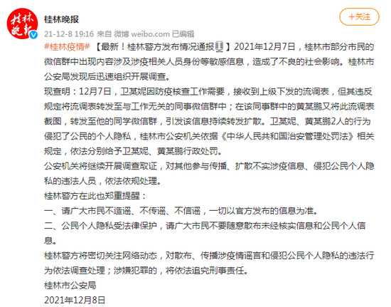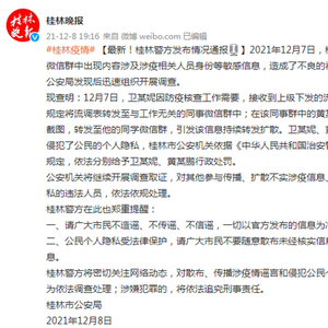2021年12月7日,桂林市部分市民的微信群中出现内容涉及涉疫相关人员身份等敏感信息,造成了不良的社会影响。桂林市公安局发现后迅速组织开展调查。