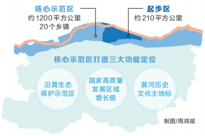 《规划》明确了核心示范区打造沿黄生态保护示范区、国家高质量发展区域增长极、黄河历史文化主地标的三大功能定位和建设成为大保护大治理展示窗口、新理念新场景展示窗口和华夏源黄河魂展示窗口的发展定位。