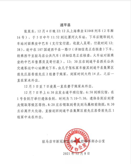 张某东,12月4日22:12从上海乘坐K1048列车(2车厢16号),于5日11:52到达漯河火车站,下车后随即到火车站对面乘坐中巴车(支付宝付款,收款人吴哥,付款时间12:38),途中在107国道西平县一路口(详细信息正在核查)下车,转乘西平至驻马店公共汽车(详细信息正在核查,火车站对面乘坐的中巴车售票员吴哥付款),13:30左右到遂平县西关公共交通客运中心站牌处下车,由儿子驾私家车接其到遂平县集聚区前先庄居委前先庄2组妻子娘家,到家时间大约14点,之后一直在家未外出。