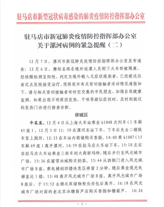 12月7日,漯河市新冠肺炎疫情防控指挥部办公室发布通告:12月6日,舞阳县两名境外返漯人员刚下火车即被隔离,经核酸检测呈阳性,判定为境外输入无症状感染者。经流行病学调查,上述两名人员于12月4日乘坐上海至漯河K1048次列车,购票座位在1车厢,但途中先后出入过2、3、5车厢,经漯河市疾病预防控制中心排查判定我市密接38人,经过我市各县区调查,有5人不在我市,已向流入地发出协查函。根据户籍地目前在我市33人,分布为西平24人,确山、上蔡和遂平各2人,正阳、泌阳、驿城区各1人。