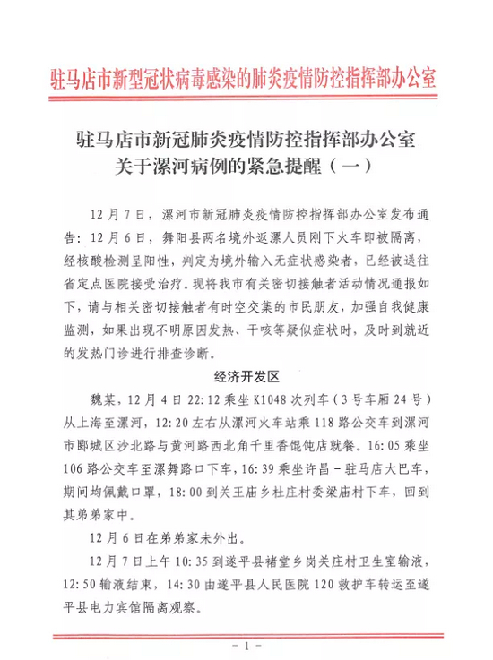 12月7日,漯河市新冠肺炎疫情防控指挥部办公室发布通告:12月6日,舞阳县两名境外返漯人员刚下火车即被隔离,经核酸检测呈阳性,判定为境外输入无症状感染者,已经被送往省定点医院接受治疗。现将我市有关密切接触者活动情况通报如下,请与相关密切接触者有时空交集的市民朋友,加强自我健康监测,如果出现不明原因发热、干咳等疑似症状时,及时到就近的发热门诊进行排查诊断。