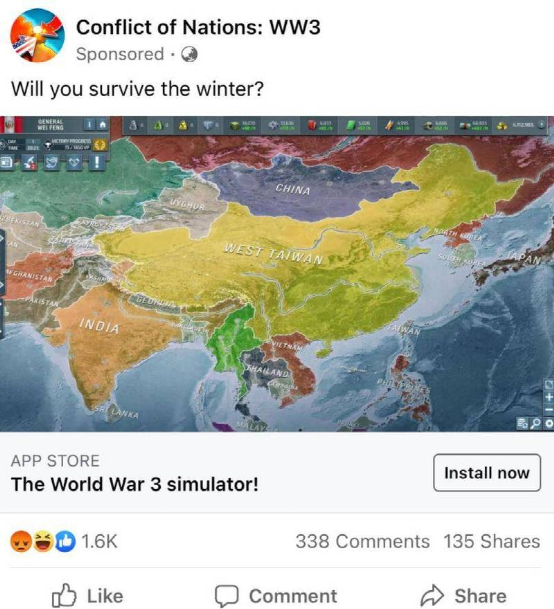 《自由时报》宣称,这款手游以第三次世界大战为主题,为即时战略多人连线游戏,同时可有超过百人进行游戏。近日有网友发现,这款手游在脸书上投放的一个广告,除了正常显示台湾位置,竟还将大陆标为“西台湾”,且将蒙古国位置标为“中国”。游戏广告内文并没有对“西台湾”多做解释,帖文内容也与此无关。对于这张令人匪夷所思的截图,就连《自由时报》也称,不知道这是否刻意为之,或者只是“误用到网络上的梗图”。
