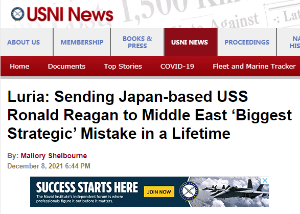 卢里亚在美国海军学院的华盛顿国防论坛上说,“我们知道,西太平洋是我们必须优先考虑的地区,我们的行动也应该表现得相一致。但我们的实际行为却是不断地返回海湾。我的意思是,在我看来,我们有生之年犯下的最大战略错误之一是,‘里根’号航母从第七舰队的辖区被派往中东的第五舰队辖区以支持从阿富汗撤军。你认为这向中国人传达了什么样的信息?我们非常容易分心,甚至轻易地将我们在太平洋地区唯一的航母撤走。”