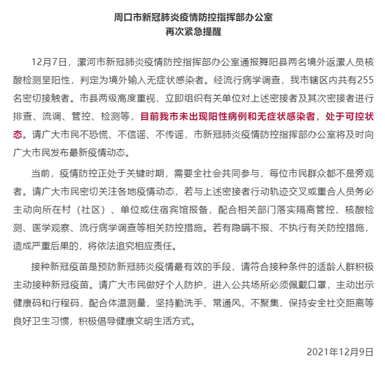 12月7日,漯河市新冠肺炎疫情防控指挥部办公室通报舞阳县两名境外返漯人员核酸检测呈阳性,判定为境外输入无症状感染者。经流行病学调查,周口市辖区内共有255名密切接触者。