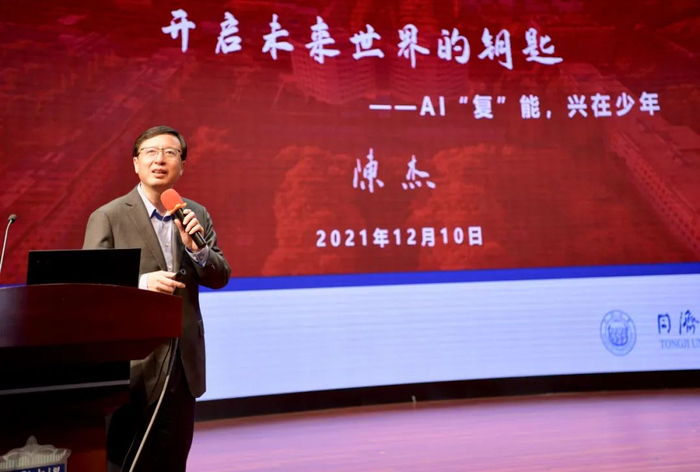 作为“同济实验班”开班第一讲,陈杰校长为实验班学生和家长代表作了题为《开启未来世界的钥匙——AI“复”能,兴在少年》的专题报告。陈杰从人工智能学科研究内容、目前学科发展情况和未来发展方向三个方面为同学们讲解了人工智能的相关知识,介绍了依托同济大学建设的上海自主智能无人系统科学中心,提出自主智能无人系统研究等服务人工智能国家战略的前沿进展情况。在报告中,陈杰还以映像同济、同学同济、天下同济三方面讲述了同济大学的办学历史、学校概况、人才培养体系及学校各项事业发展成就,向同学们介绍了复兴高中毕业学子进入同济大学就读后的出色表现和取得的优异成绩。