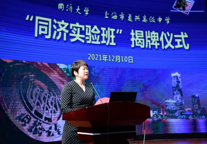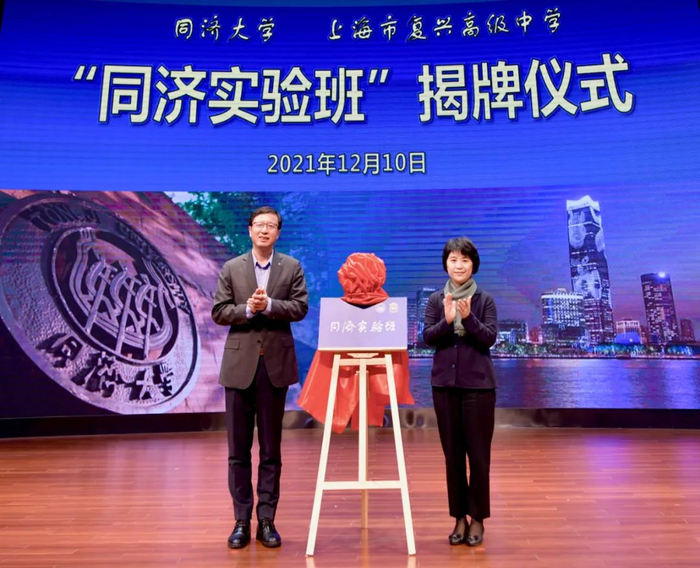 12月10日下午,同济大学-上海市复兴高级中学“同济实验班”揭牌仪式在复兴高级中学大礼堂举行。虹口区委书记郭芳、同济大学校长陈杰共同为实验班揭牌。