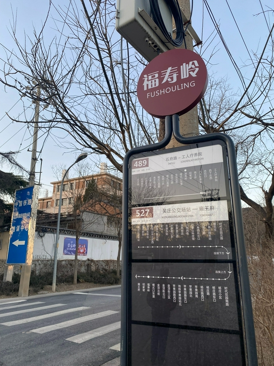 从苹果园西边的金顶街一路向北走,过了永定河引水渠,道路一下子变窄,两旁也不再是小区和店铺,取而代之的是两侧村庄拆迁之后留下的白墙。顺着道路继续向北走二三百米的距离,一个岔路口旁,就到了“福寿岭”公交站,车站停靠489路和527路两条公交线路。由于周边没有固定的居住区,尽管是下班晚高峰时间,在这里等车的也只有两三名乘客,不过在记者到达的时候,依旧有身穿黄色大衣的志愿者在这里站岗,维持上下车秩序。