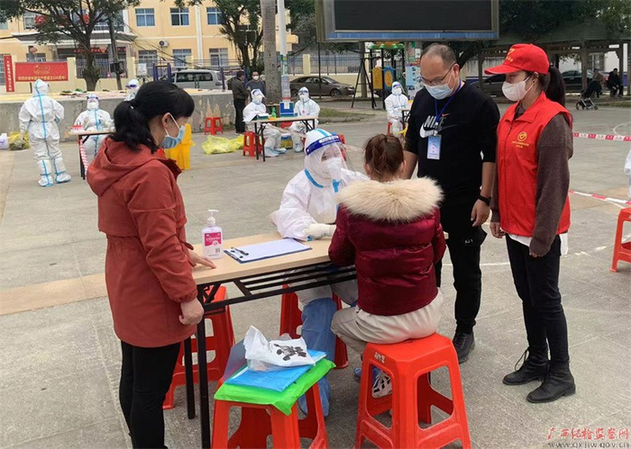 2021年12月5日,扶绥县吹响疫情防控“集结令”,县纪检监察干部围绕防控调度、核酸采样、隔离等环节强化监督。图为扶绥县纪委监委干部在核酸检测点监督统计送达指定方舱车的核酸采样数量。(扶绥县纪委监委 蓝天霓/摄)
