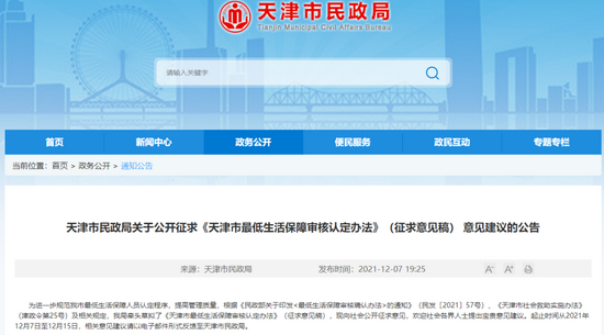 为进一步规范我市最低生活保障人员认定程序,提高管理质量,近日,天津市民政局牵头草拟了《天津市最低生活保障审核认定办法》(征求意见稿),其中明确——
